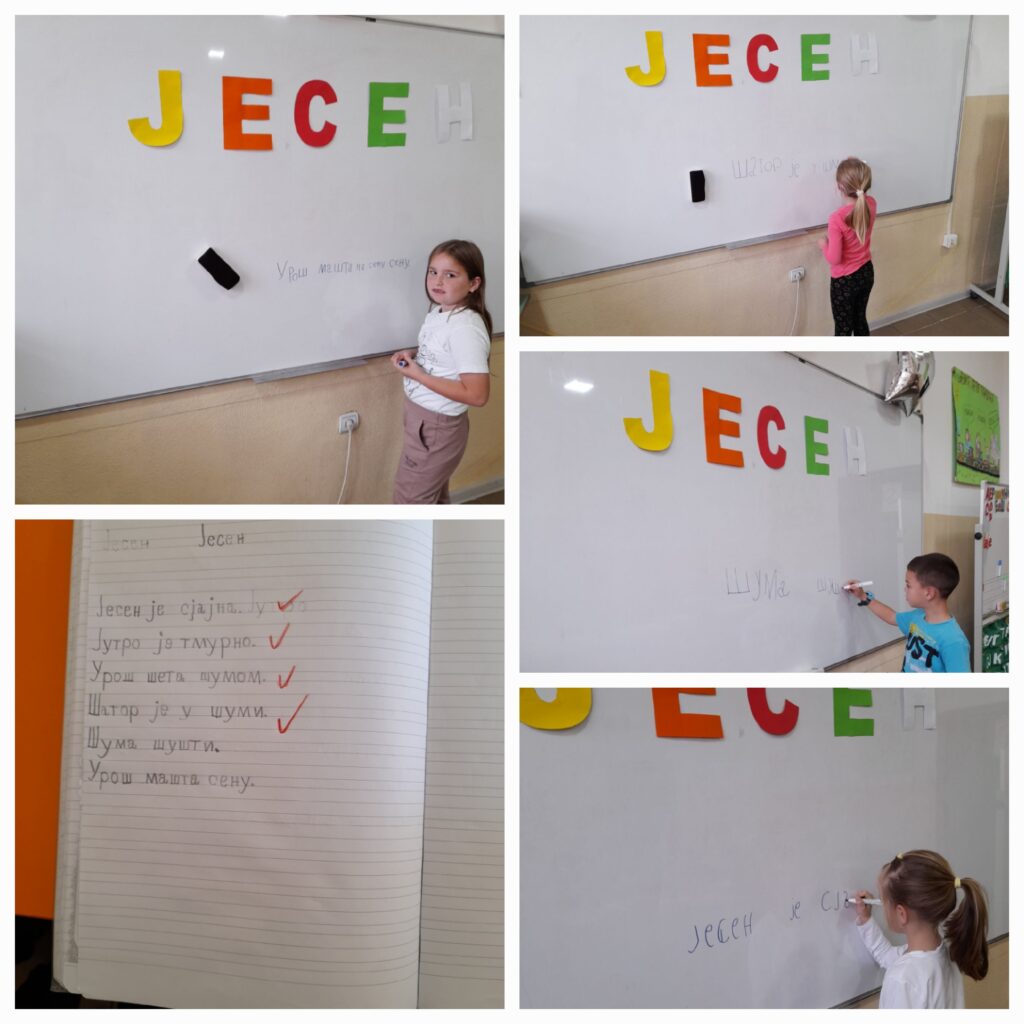 Српски језик: Вежбамо читање и писање ( утврђивање). Ученици су имали задатак да из корпе извлаче слова и од тих слова саставе реч. Дата реч је ЈЕСЕН, која се налази на табли и најављује тему дана. Затим су ученици излазили пред таблу писали реченице о јесени које им је учитељица диктирала, а затим преписивали у свеске.