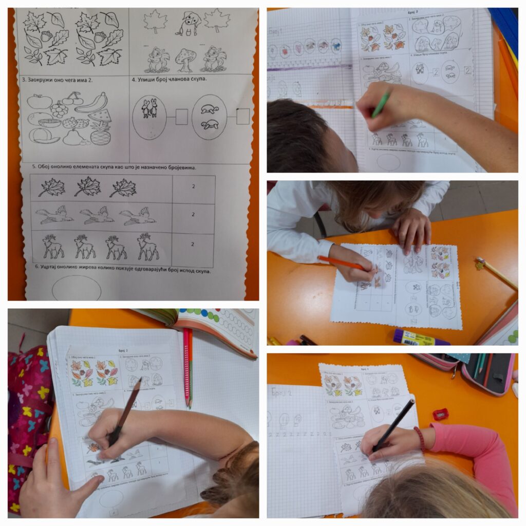 Математика: број 2 ( обрада). Учитељица је разговором о јесењим плодовима и показујући по колико воћа има у корпи истакла наставну јединицу. Након чега су ученици у свесци нацртали три скупа са по два елемента ( јесењи плодови). Затим су радили задатке на наставном листићу који су у складу са темом.