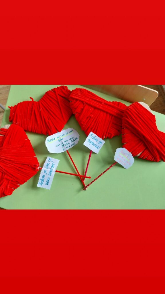 Ученици су правили пано где су писали речи које их асоцирају на љубав, цртали радове, правили дрво љубави где су писали једни другима поруке захвалности, али и правили срца од картона.