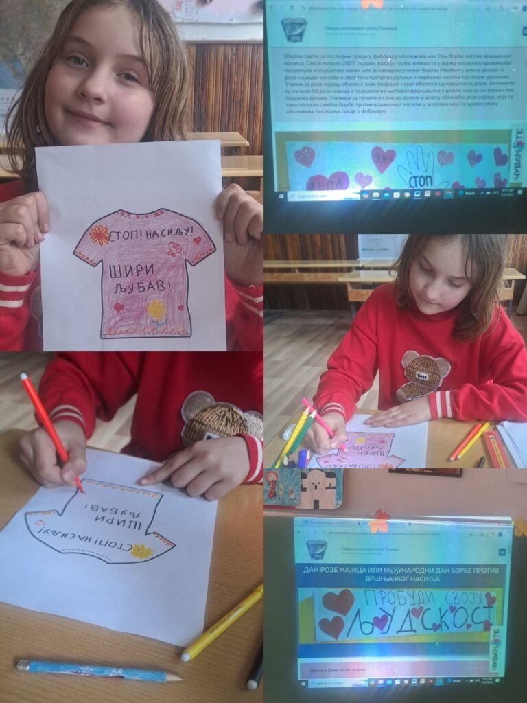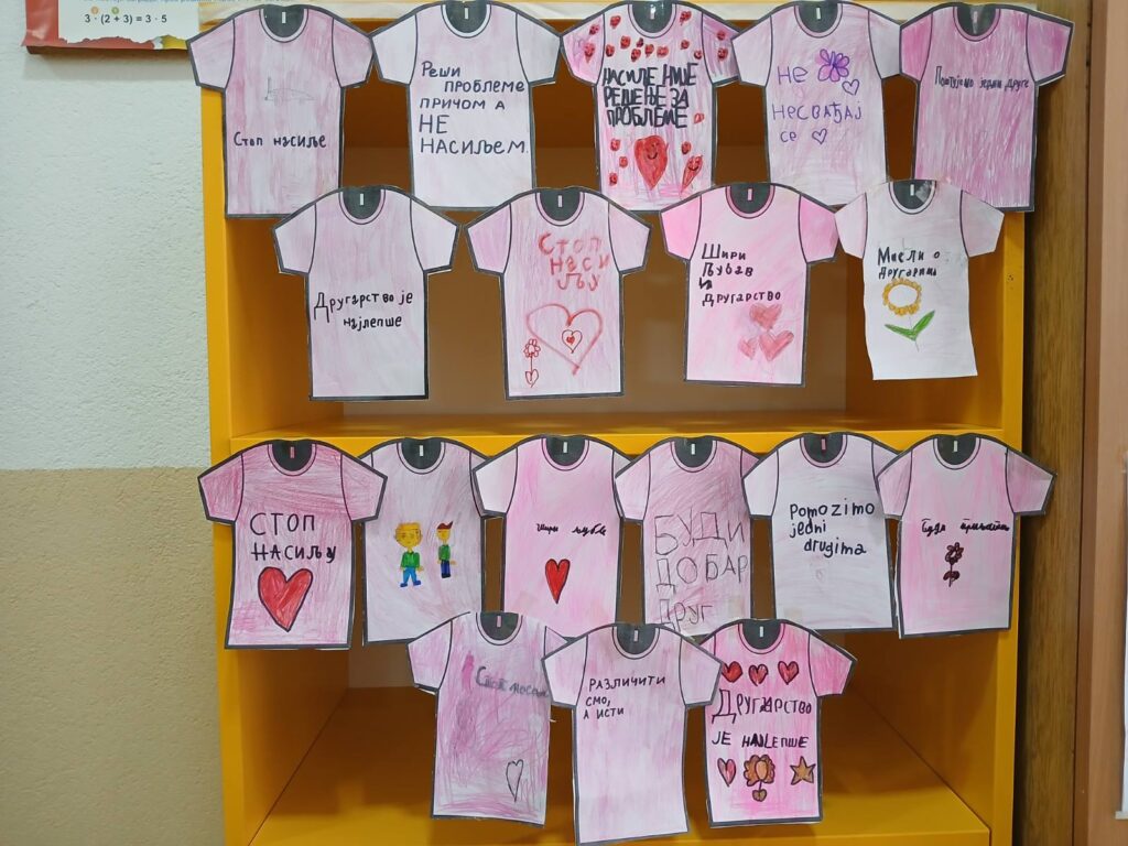 Циљ обележавања овог дана је да се међу другарима прикаже љубав, пажња, другарство, захвалност и рад у групи. Ученици су гледали презентацију о розе мајицама, а након тога су их цртали и бојили и писали поруке подршке, пријатељства и љубави на њима, а ученици трећег разреда су спремили рецитацију Школе без насиља и скеч Затворимо врата насиљу, коју су извели пред осталим ученицима наше школе.
