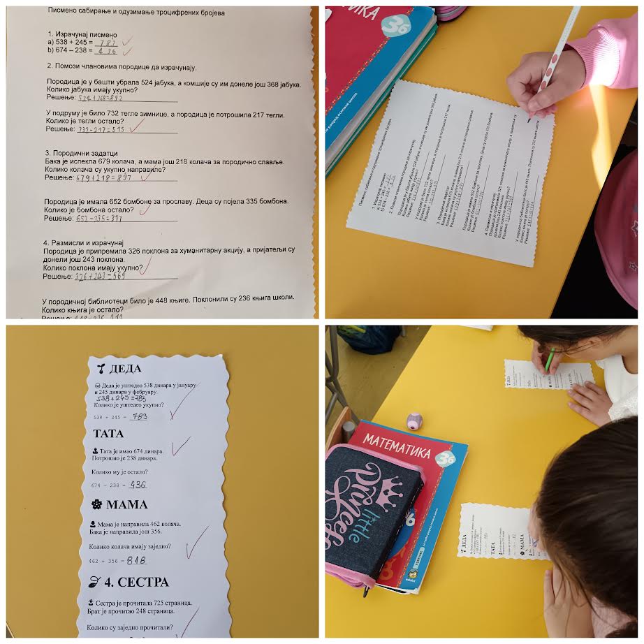 Математика: Писмено сабирање и одузимање троцифрених бројева (538+245;674-238). Ученици су увежбавали поступак рачунања и радили задатке са тематским садржајем.