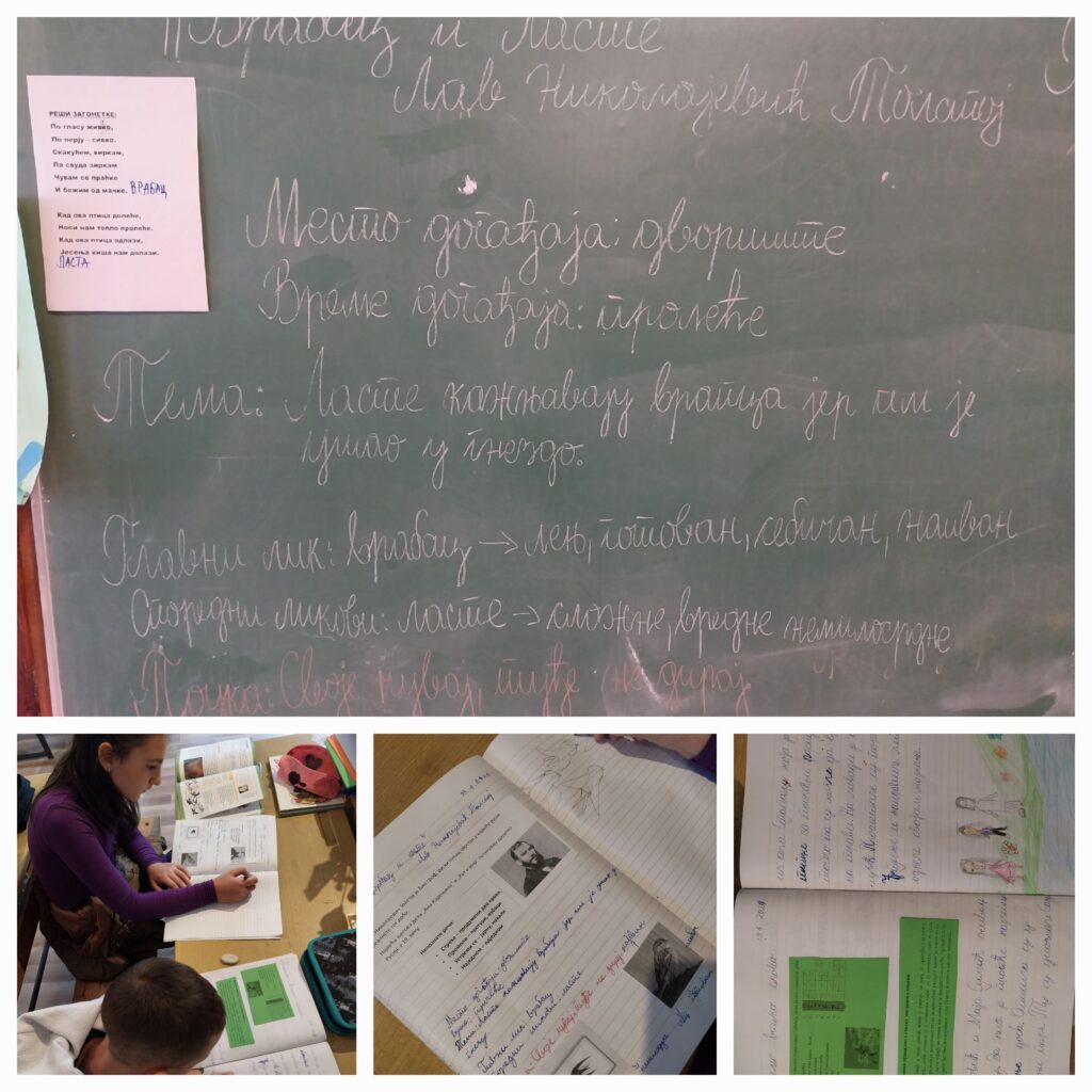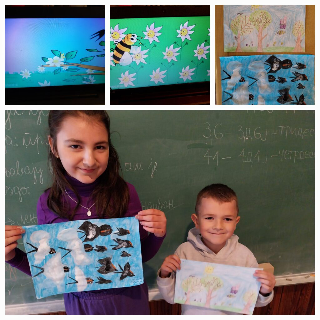 На часу српског језика дан смо започели решавањем укрштенице у 1.разреду где је решење пролеће (кроз питања су обновљена знања из Света око нас и Српског језика), док је у 4.разреду ученица решава две загонетке где су решења врабац и ласта као најава приче коју ће обрађивати. Затим је ученик 1.разреда имао задатак да правилно препише у свеску текст који је неправилно написан на листићу водећи рачуна о писању велког слова.Текст је био везан за пролеће. Са ученицом 4.разреда текст урађена је дидактичко-методичка анализа текста а листићи су били у духу пролећа у складу са причом и илустроване ласте на крају часа уз слушање композиције „Ласте“ Сретена Станчевића.