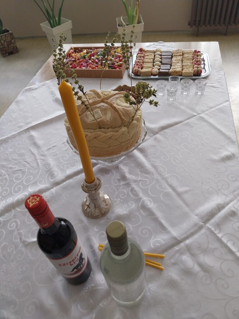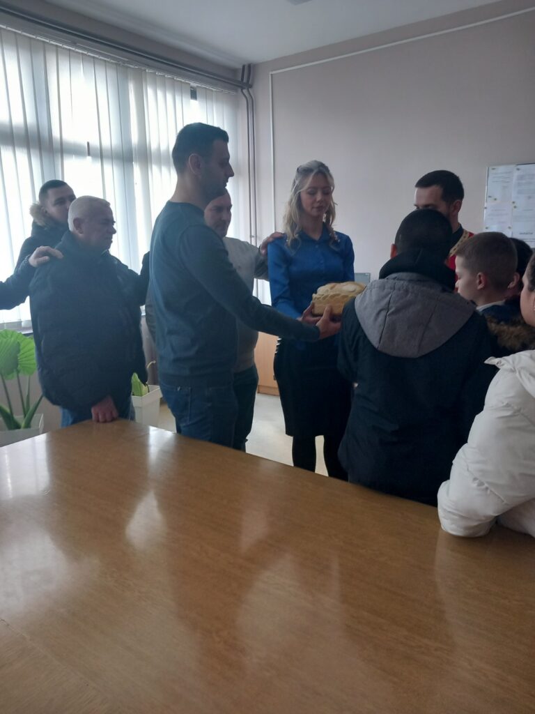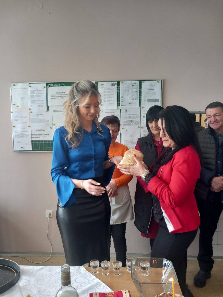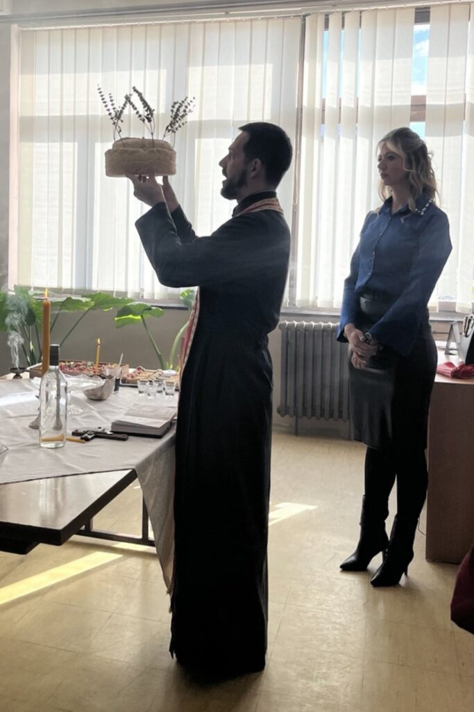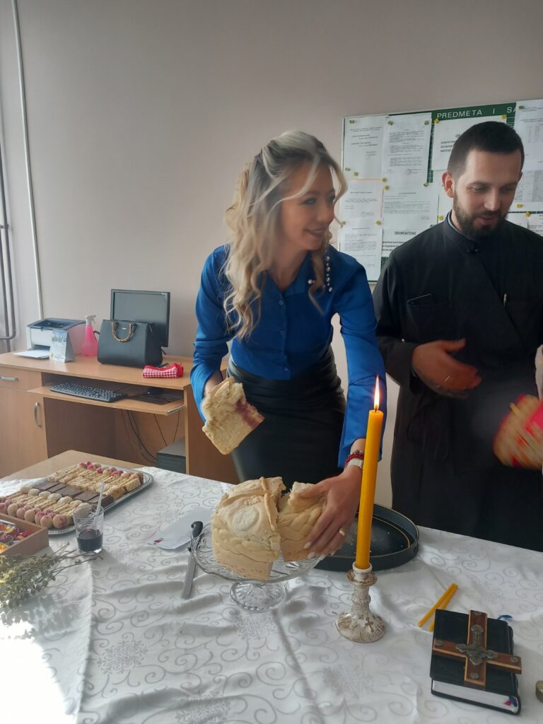 Церемонија обележавања Савиндана настављена је освећењем жита и резањем славског колача. Част да први пут буде домаћин славе припала је учитељици Снежани Шапоњић, која је овом приликом део славског колача предала директорици школе Ирени Матовић, која ће ту улогу преузети следеће године.
