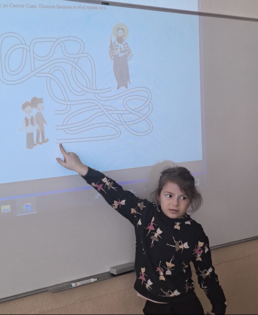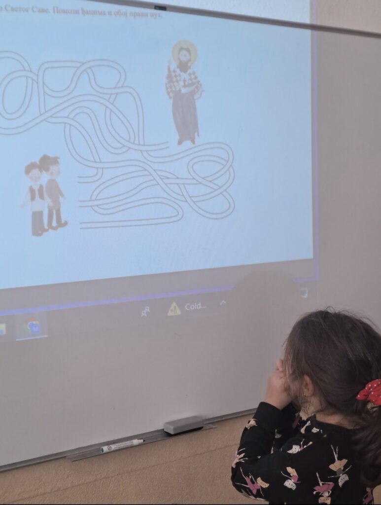 слагалице који недостаје на слици Светог Саве, затим тражењем најкраћег пута којим ђаци треба да дођу до Светог Саве, где смо се