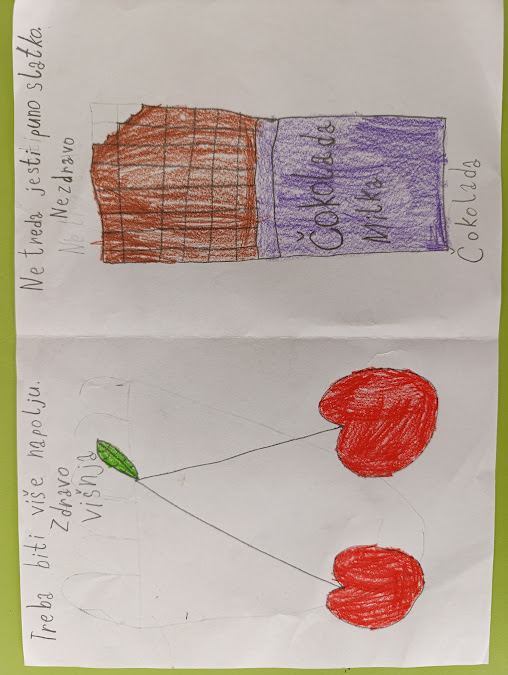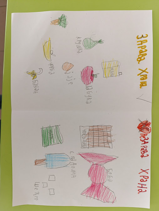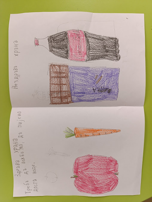 Пети час су биле Слободне активности. Пошто је наставна јединица гласила ,,Светски Дан здрва”, ученици су имали задатак да на папир А4 формата, пресавију на пола. На једној страни су писали оно што је здраво у исхрани да примењујемо, а ма другој, нездрава храна или пиће.