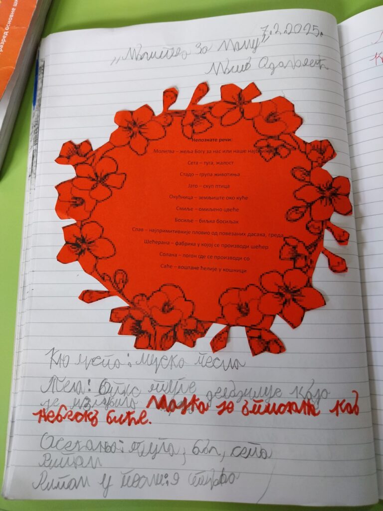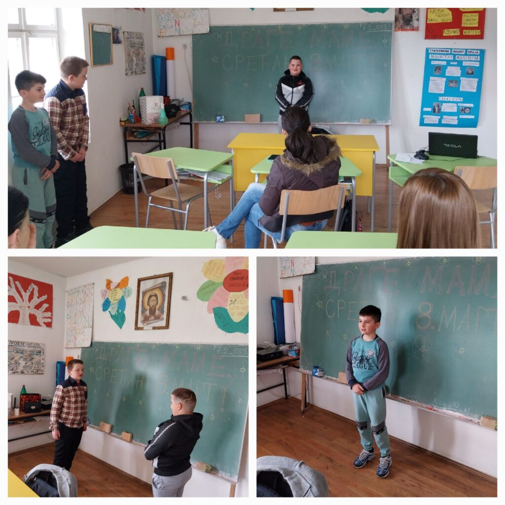 Кроз српски језик, математику и ликовну културу обележен је овај тематски дан. Дан је завршен приредбом ученика за маме коју су припремили кроз рецитације и извођење драмског текста и том приликом уручили поклоне које су правили на часовима слободних активности и ЧОС-у.
