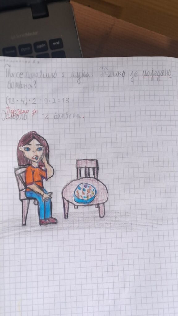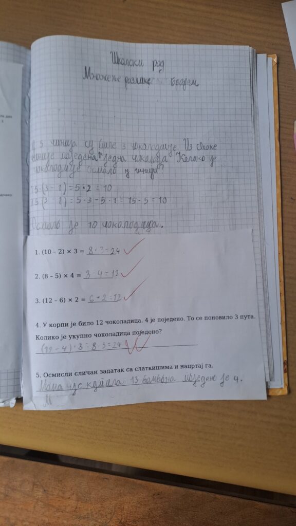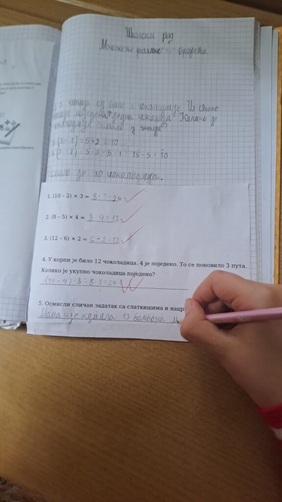 Математика – множење разлике бројем: Кроз конкретне задатке ученица је увежбавала примену математичке операције множења разлике. Задатке је решавала усмено и писмено, уз примену илустрација. На крају је самостално формулисала задатак и илустровала га.