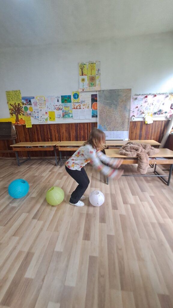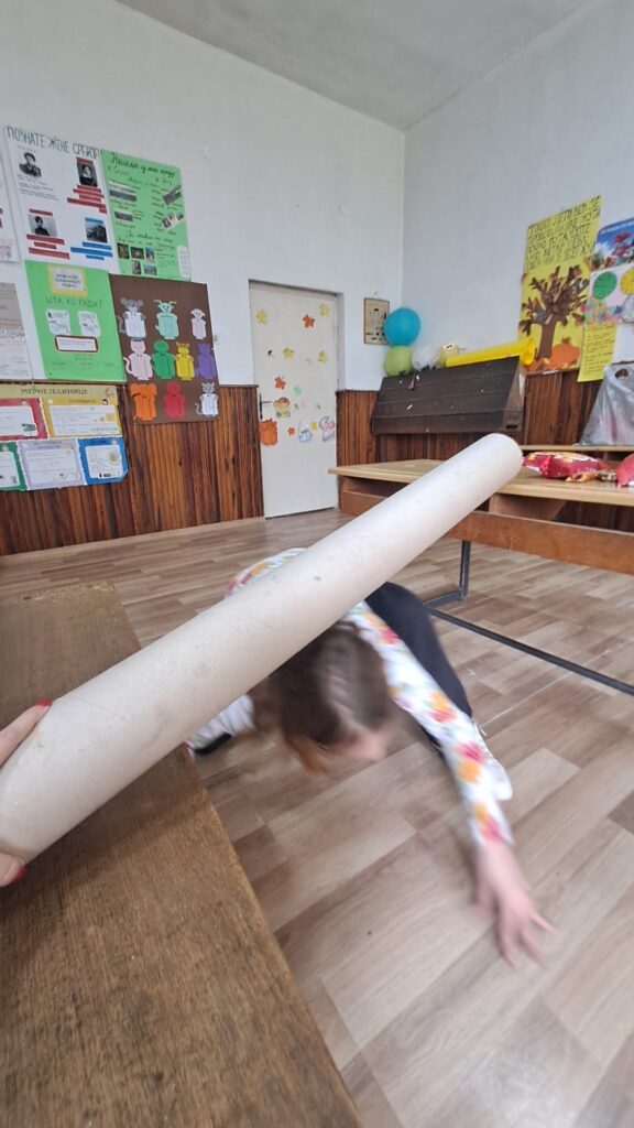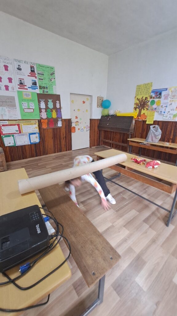Реализован је прилагођен полигон у учионици, у оквиру кога је ученица савлађивала препреке различитим кретањима (прескакање, провлачење, ношење предмета, гађање мете, ходање по линији). Свака успешно одрађена активност имала је за награду неки слаткиш. Све активности праћене су мотивишућим причама и задацима. Ученица је показала ангажованост и уживала у активностима.