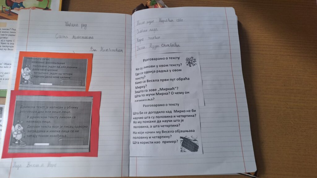 Српски језик – обрада текста Слатка математика: Ученици је прочитан текст и вођен разговор о садржају. Посебан акценат стављен је на препознавање математичких појмова у књижевном тексту. Ученица је самостално одговарала на питања, цртала сцену из приче и осмислила свој задатак инспирисан причом.