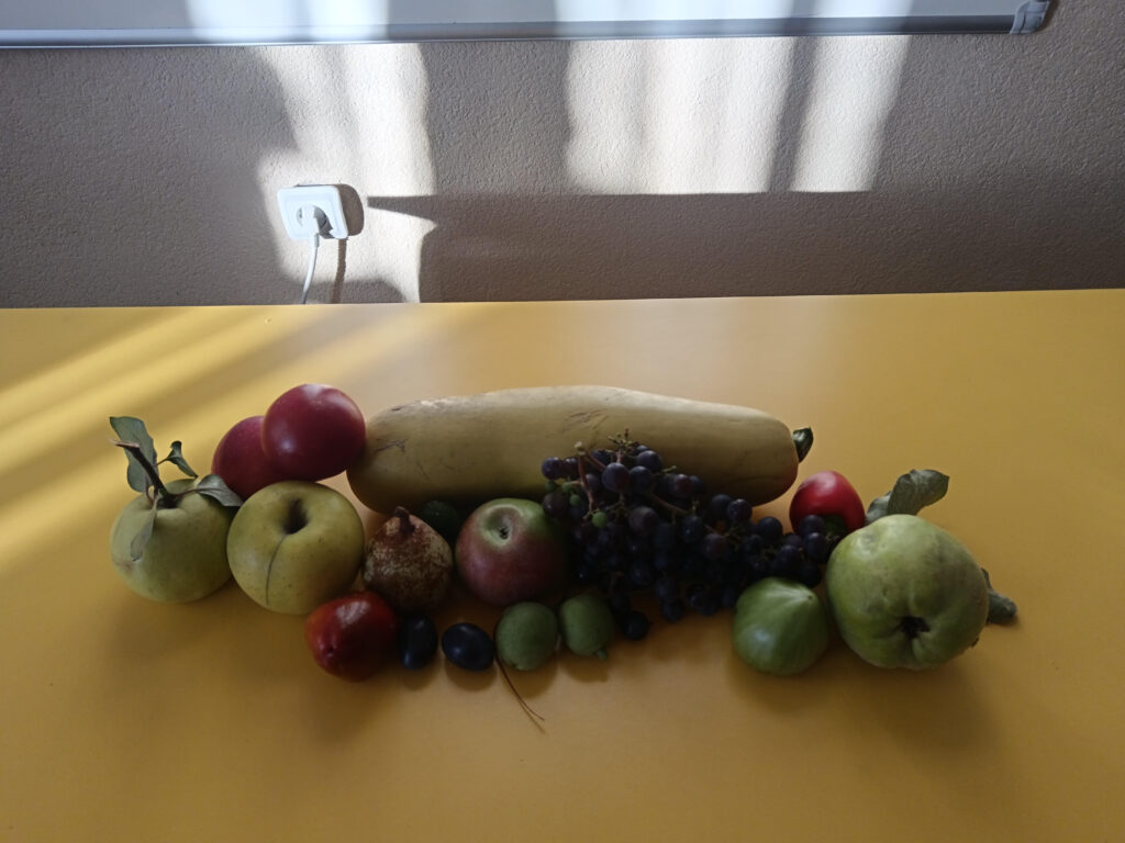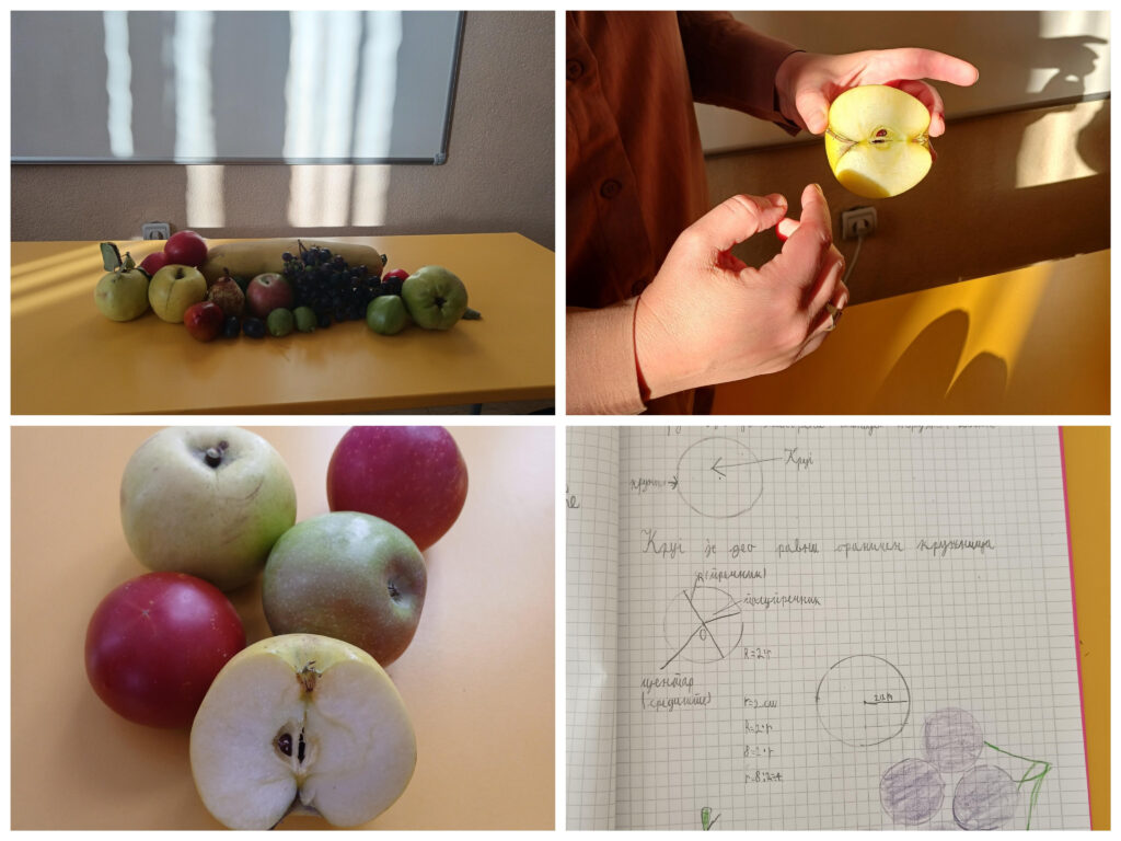 Математика наставна јединица: Круг и кружница; Цртање круга и кружнице. Ученици су имали за задатак да од куће донесу јесење плодове које имају (јабуке, бундеве, кестени , дуње, грожђе). Кроз разговор издвајају облик јабуке, дуње. На пресеченој јабуци јасно је видљив круг и кружница. Након обрађеног наставног садржаја (цртање, круга и кружнице, пречник, полупречник, центар). У завршном делу часа цртају јесењу слику од кружница (јабука, грожђе…).
