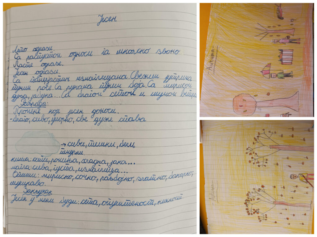 Српски језик наставна јединица: Јесен. Описивали су јесен,годишње доба које је прошло, о променама у јесен,описују плодове,лишће,и све се записује на табли и осећања која у њима буди јесен.