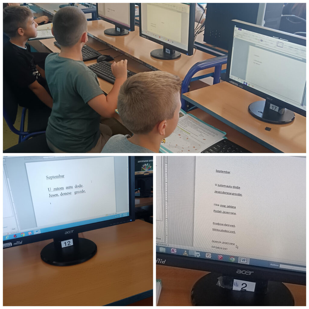 Дигитални свет: Рад са текстом.Ученици су на овом часу имали за задатак да откуцају неколико реченица о јесени или обрађену песму „Септембар“.