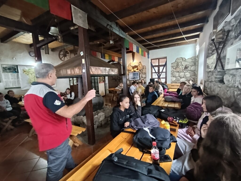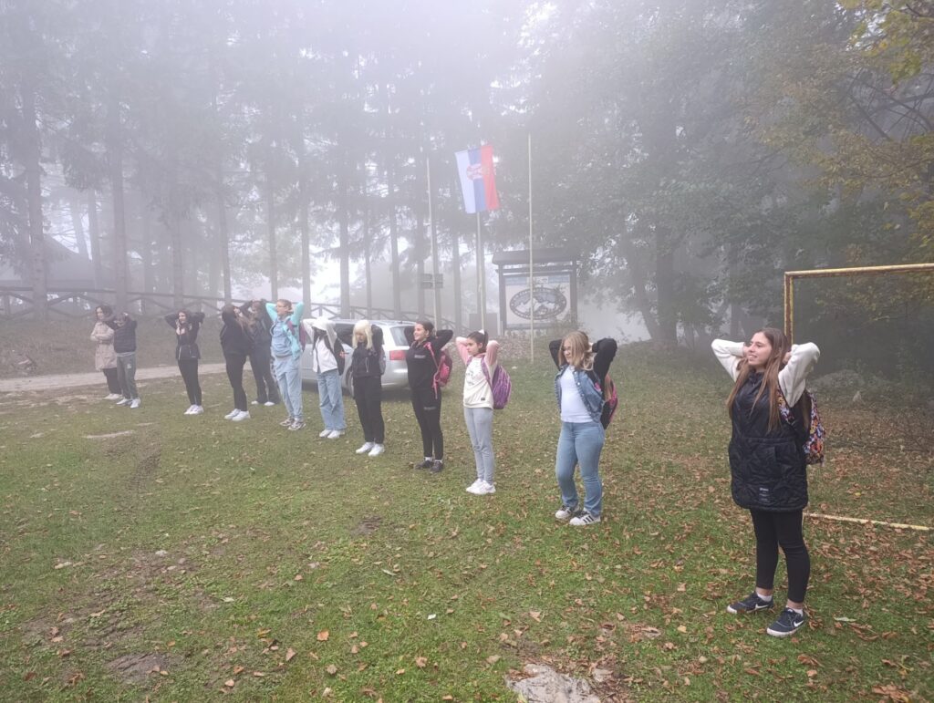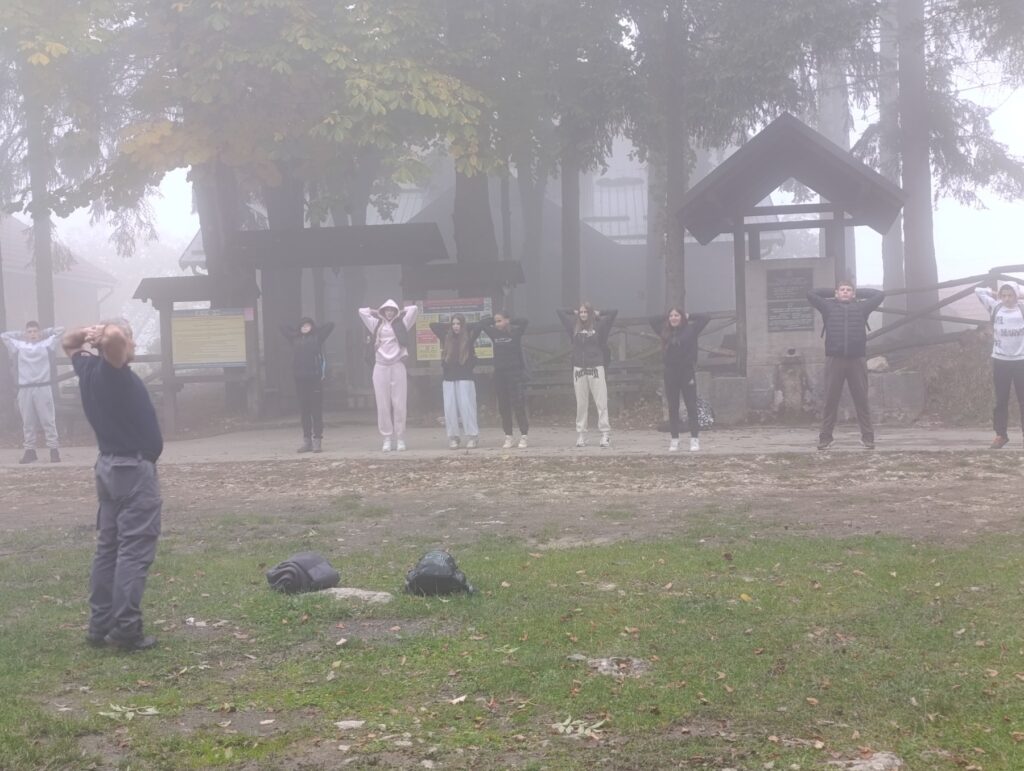 Након презентације ученици су изашли испред дома где има је водич показао неколико вежби за загревање, разгибавање и начин правилног дисања у склопу припрема за пешачење.