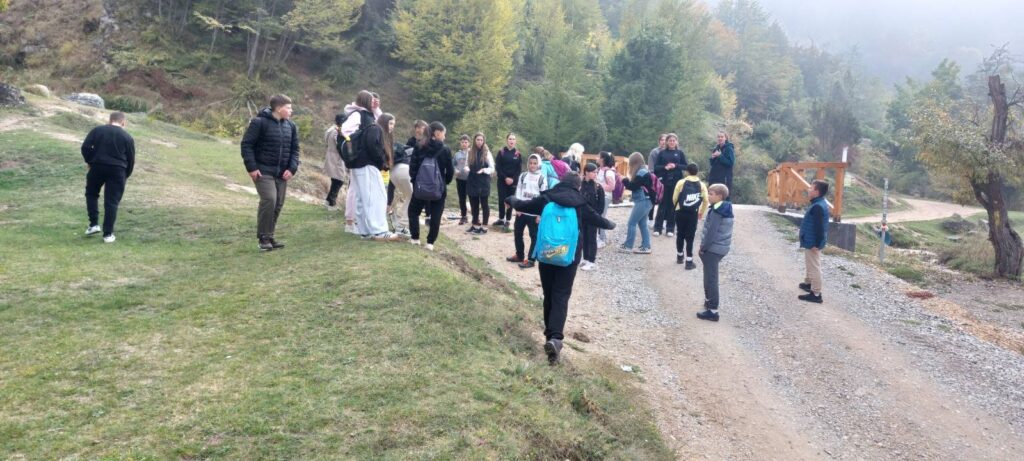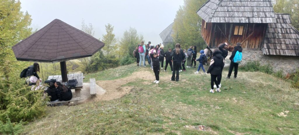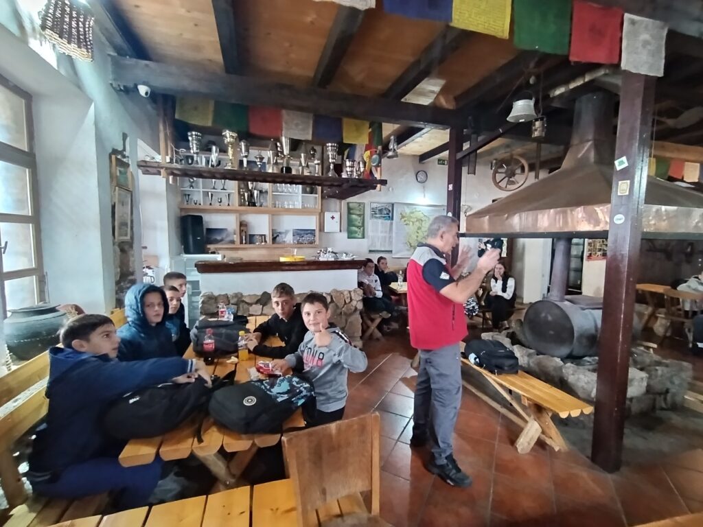 Потом су се ученици окупили и у пратњи наставника и домаћина вратили до планинарског дома. Ту смо се задржали петнаестак минута које су ученици искористили за одмор, игру, дружење и освежење.
