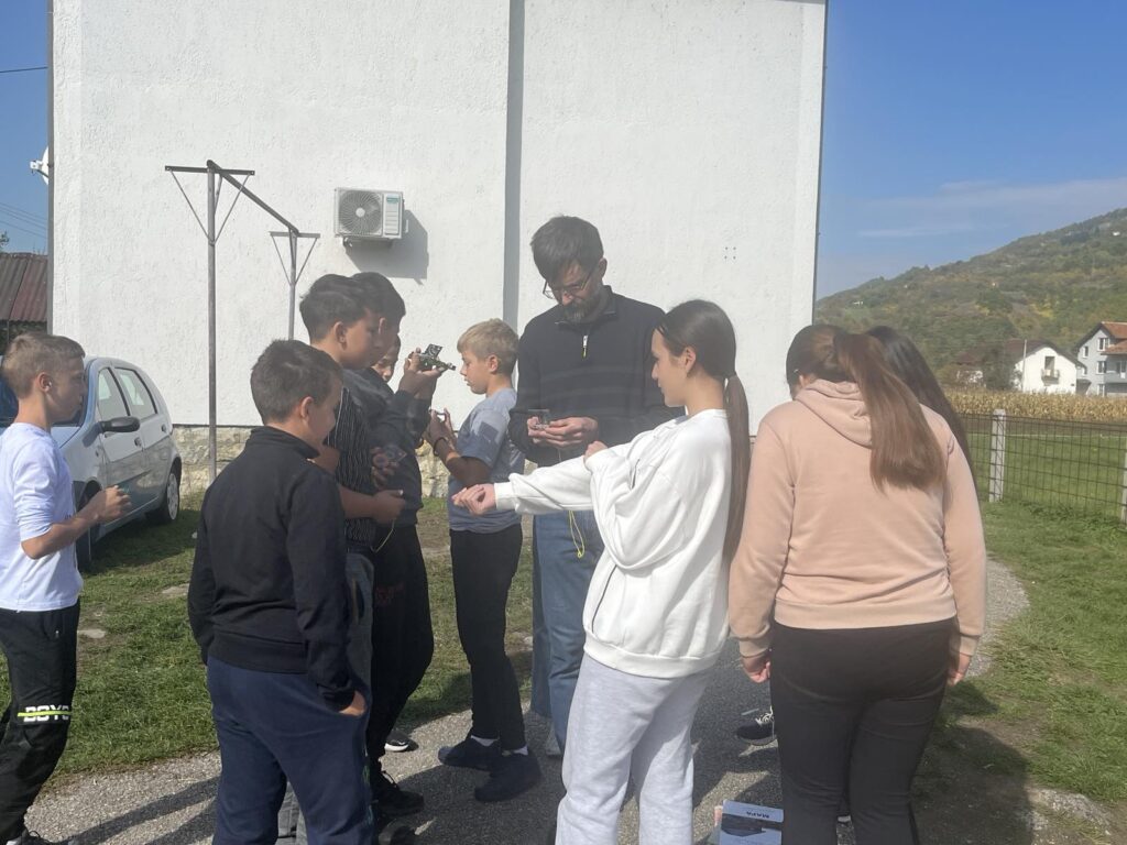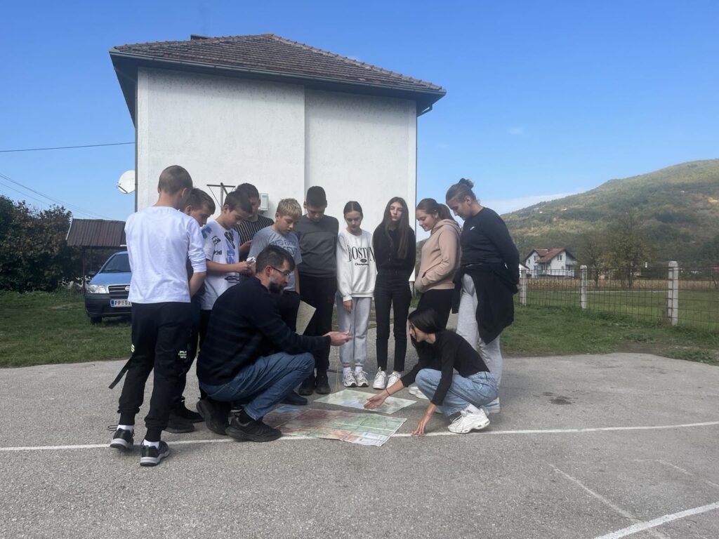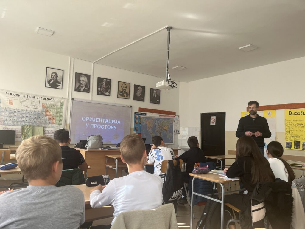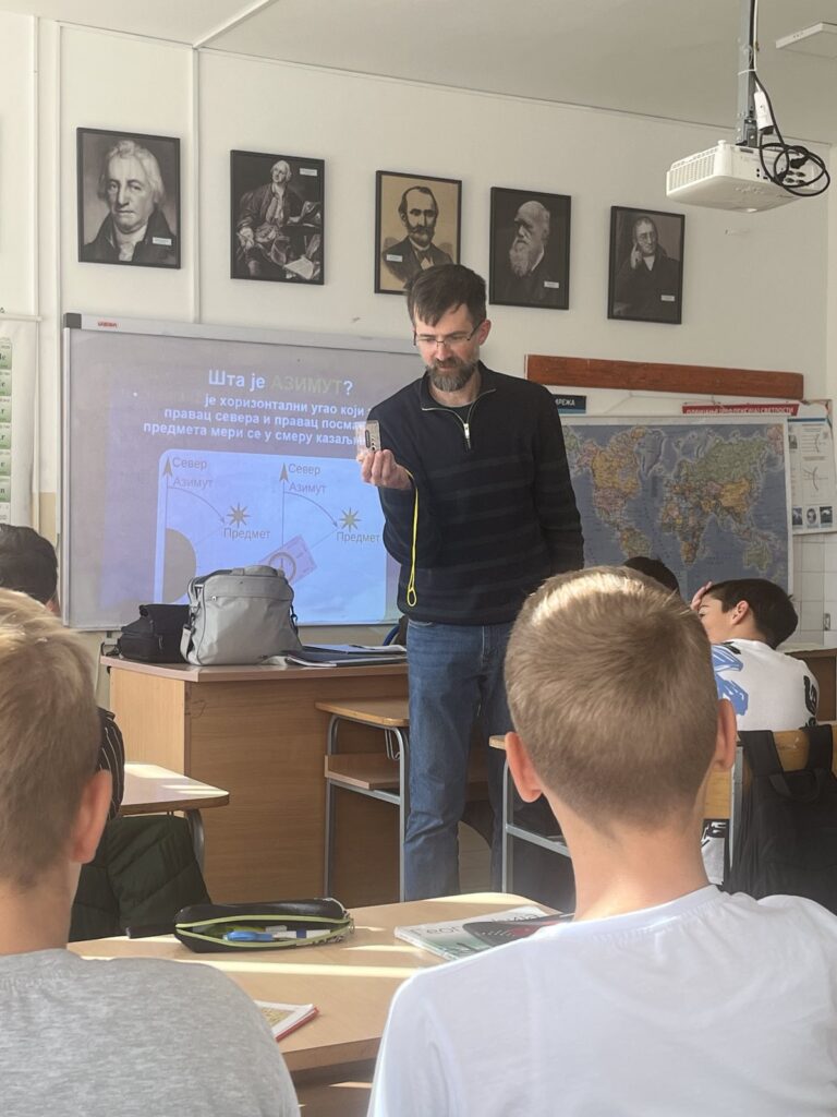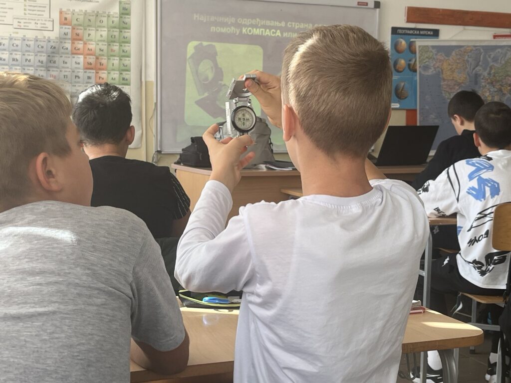 Други део часа реализован је у школском дворишту где су ученици имали прилику да се опробају колико су вични оријентацији у простору, помоћу Сунца и ручног часовника, верских објеката и компаса. Затим су имали задатак да оријентишу карте општине Пријепоље и карту Републике Србије и да одређујући азимут покажу у ком правцу се налазе нека места на територији наше општине или неки од већих градова у Србији и окружењу.